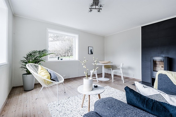 Stuen, som er boligens naturlige samlingsrom, har lyse vegger og en lun farge på furugulvet. Her kan man leke seg med farger, en fondvegg eller interiørelementer med aksentfarge som setter særpreg til stuen. Vedovnen har en moderne utførelse med glassfront som gir god varme til hele boligen. Planløsningen i stuen gir rom for flere sittesoner, eller et ekstra soverom, om ønskelig.