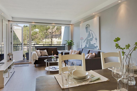Lys stue med god plass til en sittegruppe og spisebord.