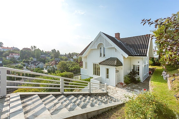 Marstranderveien 12 er en flott og ærverdig sveitservilla fra 1928, over tre plan. Boligen ligger på høytliggende tomt med sol, utsikt og store skiferbelagte uteplasser. Boligen har en deilig hagestue med glasstak og utgang til terrasse med utepeis. Det finnes også balkong utenfor stuen og en flott balkong i andre etasje med rikt utsmykket overbygg. Eiendommen har parkeringsplass med rom for tre biler.