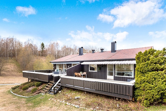 Salongstue: Parkett på gulv, malt strie på vegger, plater i tak. Utgang til sydvendt terrasse på 39 kvm. Terrassemarkise. Belysning på terrassen.