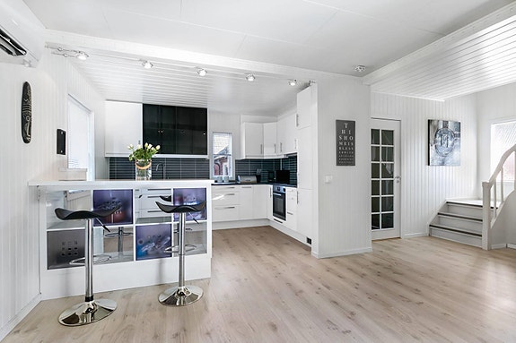 Kjøkken: Laminat på gulv, ferdig malte panelplater på vegg og hvite panelbord i tak. Hvit innredning med glatte fronter, innebygde hvitevarer, flis mellom over og underskap.
