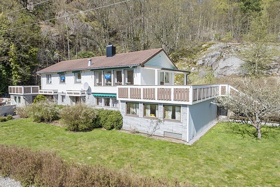 Stor familiebolig innredet på to plan, fin utsikt mot elven og landskapet mot øst.