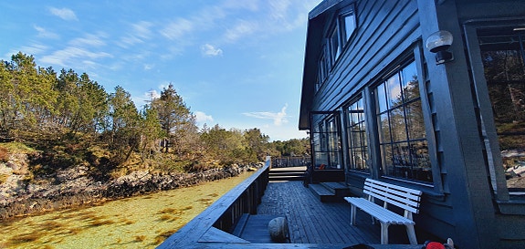 Denne sjøperlen ligger i en lun badevik med fantastiske fiskemuligheter rett utenfor kaikanten. Det er anbefalt å bruke båt for å komme til hytten. En kan gå, men det er vanskelig terreng uten sti.