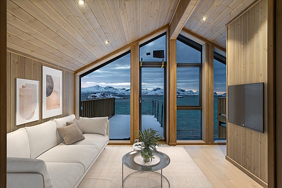 Hyttene våre ligger helt i sjøkanten – der utsikten ut mot havet, nordlyset og sønnavinden er inkludert.