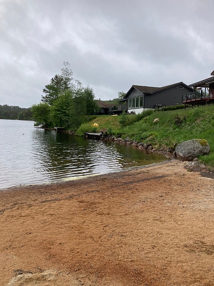 Det er terrasse rundt på to sider av hytten. Dermed har man sol fra morgen til kveld. Gressplen rundt hele hytten. Sandbunn fra tomten og ut i vannet. Meget gode fiskemuligheter...mye fisk i Krågelandsvannet