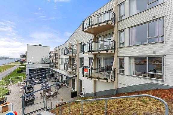 Fra leiligheten er nydelig utsikt utover sjøen. Utsikten kan nytes fra både hovedsoverommet, stue og terrasse. Morgensol fra terrasse i front og kveldssol ved inngangsparti.