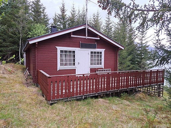 Koselig tømmerhytte med fjordutsikt i Kattfjord som ligger skjermet til med skog rundt oppe i høyden.