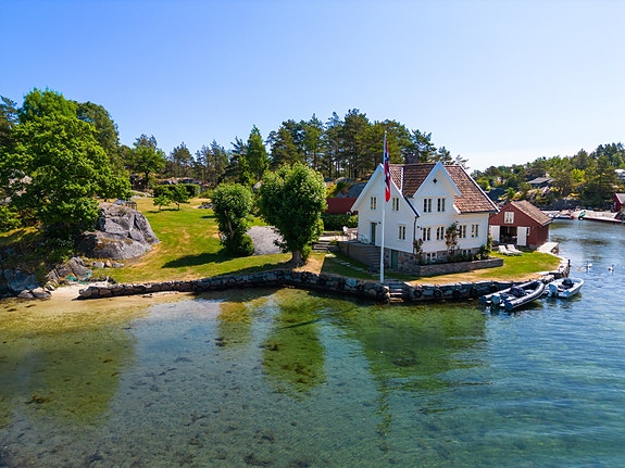 Drømme-fritidseiendom i Blindleia - hel holme på 15 mål med nydelig sørlandshus, sjøbu, uthus, brygger og strand