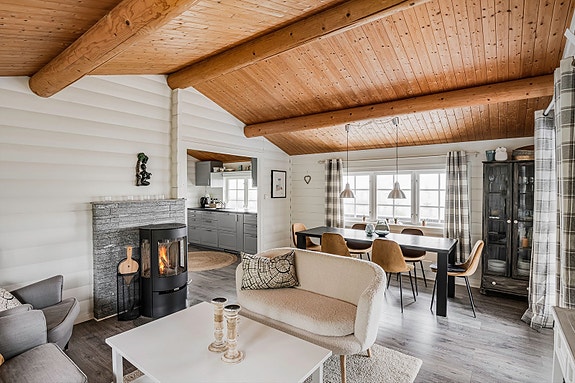 Vi har gleden av å presentere denne lyse og koselige familiehytta beliggende i Ryskdalen hytteområde med gode solforhold og en fantastisk utsikt. Hytta går over 1 plan og består av et flott og koselig oppholdsrom med plass til spisebord og med åpen kjøkkenløsning, 3 romslige soverom, bad fra 2012, teknisk rom med plass til vaskemaskin og en romslig entre.