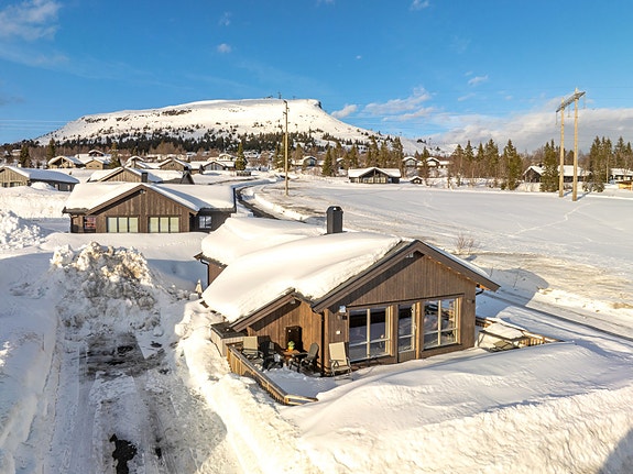 Hytta ligger fint til i enden av et nyetablert hyttefelt med velpreparerte langrennspor kun 40 meter fra hytteveggen.
