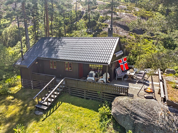 Hytte med god standard, hems og oppgradert terrasse - enkel adkomst, eget båtfeste og skjermet beliggenhet for seg selv