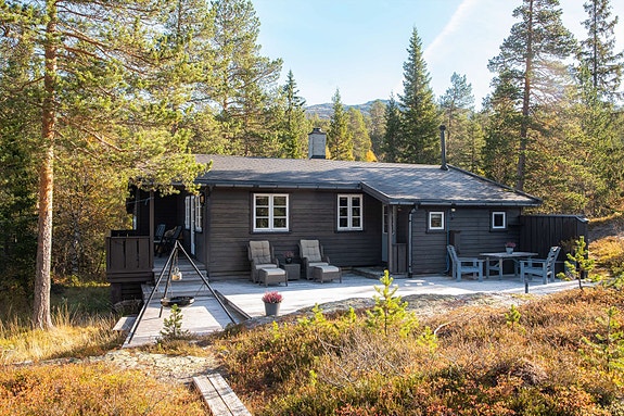 Hytta har en romslig stue med god takhøyde som gir en luftig atmosfære.