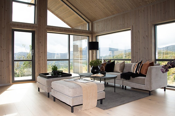 Hytta har god planløsning og luftig himling med store vinduflater som gir gir maksimal utsikt utover fjellrekka. Det er pent allrom, 3 soverom, 2 bad, badstue og vaskerom på hovedplan, samt ekstra loftareal med muligheter for TV-stue og to disponible rom, perfekt for en familie med barn eller ungdom, eller når du har med venner på hytta.