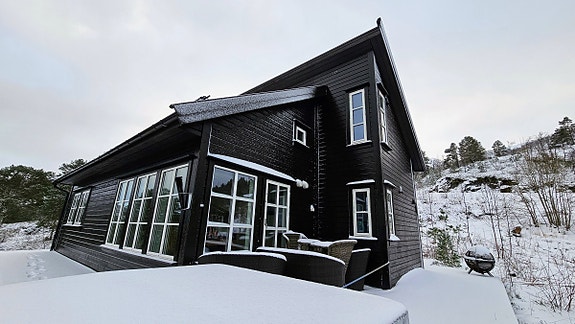 Velholdt hytte med sjarmerende uttrykk — her ser du den flotte fasaden mot nordvest.