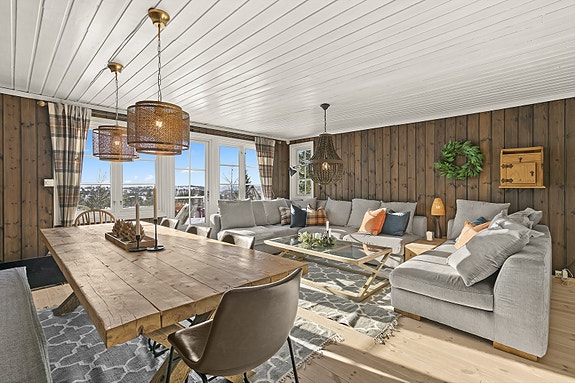 Innvendig finner du entré, bad, stue, kjøkken, sovealkove og tre soverom. Slik hytta er innredet nå, så er det til sammen 10 sengeplasser. Stuen og kjøkkenet er et nydelig allrom med flott utsikt, stemningsfull peisovn og moderne innredning. Alle hvitevarer er integrert.