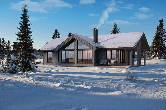 Glittertind har store vinduer som gir deg en opplevelse av å være tett på naturen. Fasaden gjør seg like godt ved sjøen som på fjellet. Med den åpne løsningen i stue og kjøkken får du mye lys og volum inn i oppholdsarealene.