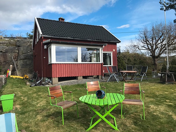 Fjordutsikt, sol hele dagen. De 3 B'er er til stede i fullt monn. Deilig, lun, innglasset uteplass med god sjøutsikt. Selges komplett med innbo og løsøre, gressklipper, utemøbler, vimpel og flagg, VG-jolle med seil, årer, kjøl og ror.