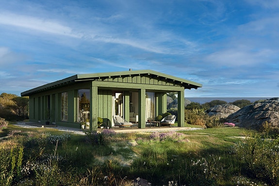 Sommer Vy3. Illustrasjonbilde av prosjektert hytte på tomten.