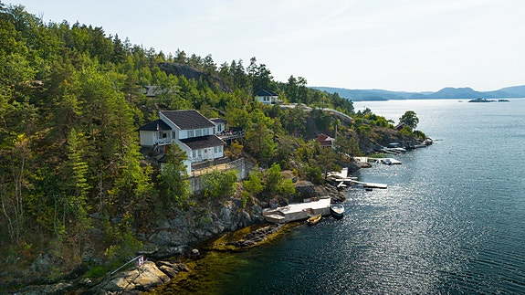 Strandeiendom med hytte, anneks, uthus og brygge. Herlig utsikt og sen kveldsol