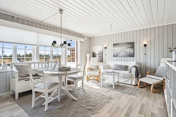 Stuen har store vindusflater og godt med dagslys inn, fin plass til sofa og spisebord.