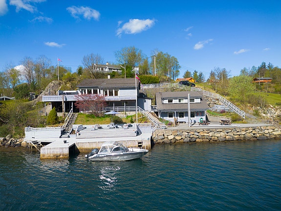 Fritidsboligen er av sjelden stor størrelse, og er svært innholdsrik mht soverom og bad/wc. Passer perfekt for storfamilien eller firma. Fine opparbeidet uteområder med naust over to etasjer, kai med god dybde, og kran for opptak av båt. Kun 10 min kjøring fra Sløvåg