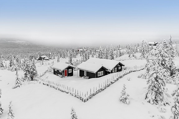 Hytte med uthus, beliggende i flott høyfjellsterreng. Nydelig utsikt og gode solforhold.