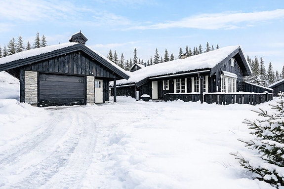 Hytta ligger på en stor, pent opparbeidet tomt og byr på gjennomtenkte løsninger som passer godt for både avslapning og aktivitet. I tillegg til selve hytta følger det med en romslig garasje og en praktisk utvendig bod med god lagringsplass.
