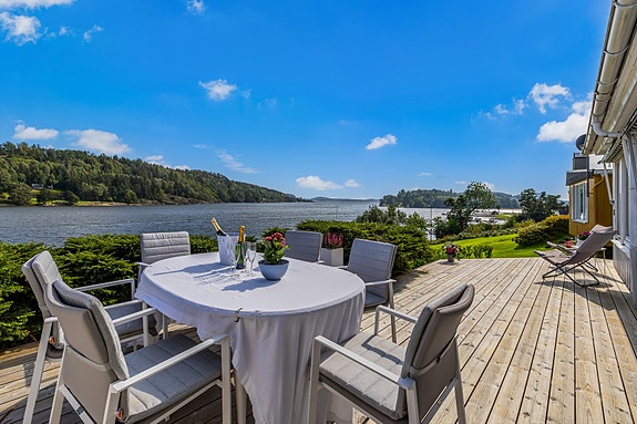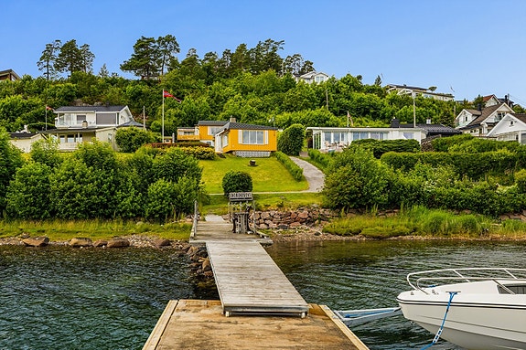 Velkommen til et lite ferieparadis på Storevar, med brygge og sandstrand rett nedenfor eiendommen!