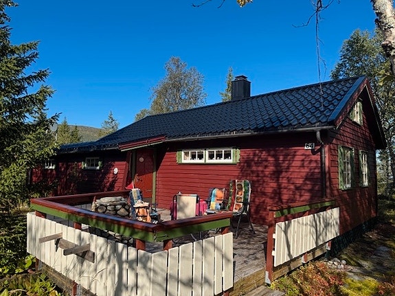 Hytta fremstår som en velholdt og sjarmerende fritidsbolig oppført i tradisjonell bindingsverkskonstruksjon med liggende bordkledning og saltak tekket med stålplater. Fasaden er malt i nyere tid (ca. 2019), og gir et pent og solid uttrykk. Vinduer i tre med koblet glass og malt hovedytterdør gir hytta et tidløst og koselig preg. Terrassen ved inngangspartiet er på ca. 30 m² og bygget med impregnerte materialer – et perfekt sted å nyte solen og utsikten mot de omkringliggende fjellene.