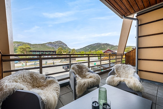 Flott utsikt mot skisenteret og fjelltoppene fra balkongen