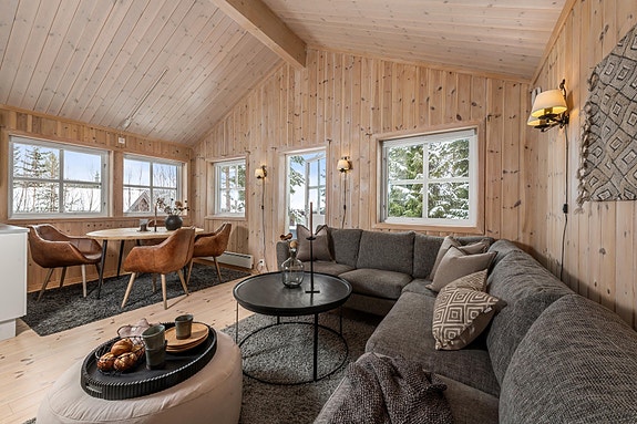 Hytta er holdt i en tradisjonell stil, kombinert med moderne komfort. Den luftige stuen med røstet tak og flere vinduer gjør rommet innbydende og åpent. Det er åpen løsning mellom stuen og kjøkkenet som gjør rommet sosialt og hyggelig. Videre har hytta 3 romslige soverom, 1 bad, bod , vaskerom og en stor terrasse.