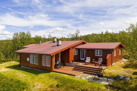 Store, lune og solrike terrasser på begge sider av hytta, hvor man kan nyte både kveldssola og utsikten mot Hallingskarvet.