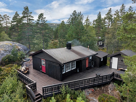 Tiltalende hytte med flott utsikt, usjenert, lun og sentral beliggenhet. Frittstående bod og stor terrasse