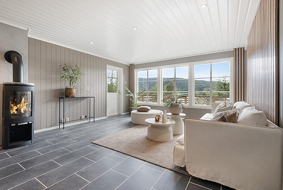 Fin plass til sofagruppe. Store vindusflater slipper godt med dagslys inn.
