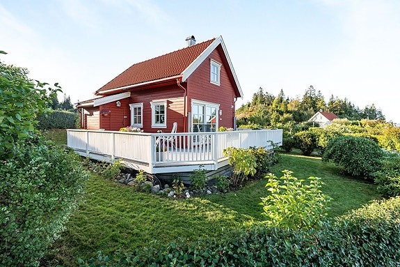 Idyllisk fritidseiendom i kolonihage med solrik og tilbaketrukket beliggenhet. Store utearealer og innbydende hytte.