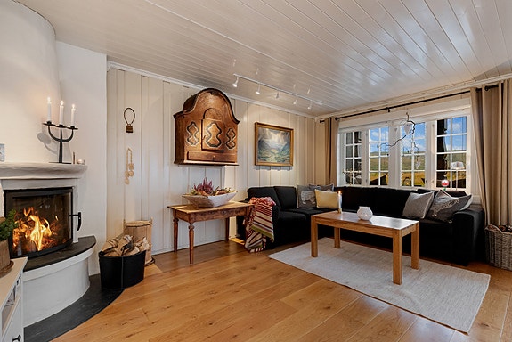Velkommen til Valtjednvegen 189C på Gomobu. Leiligheten har en lys og koselig stue med panel på vegger. Foto: Christine Stokkebryn