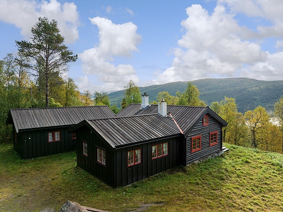 Hytta består en original tømmerhytte fra 1919 med stor, overbygget, lun terrasse med flott utsyn. Her er det romslig stue med peis, TV-stue og ett soverom. I tillegg har den eldre delen to
