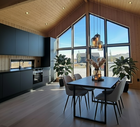 - Stue/kjøkken med god takhøyde og store vinduer som gir en luftig og god romfølelse