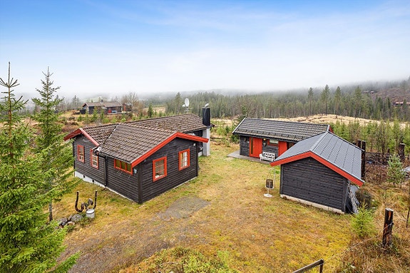 Hovedhytta på 62 m² har en arealeffektiv planløsning med tre soverom og åpen stue-/kjøkkenløsning. Kjøkkenet er nytt i 2025 og det er nytt heltre furugulv fra 2024. Peisovnen i stuen gir god varme og hygge, og fra stuen er det utgang til en overbygd terrasse på 17 m². I tillegg er det et anneks på 23 m² med innredet rom og et uthus på 16 m² med god lagringsplass.