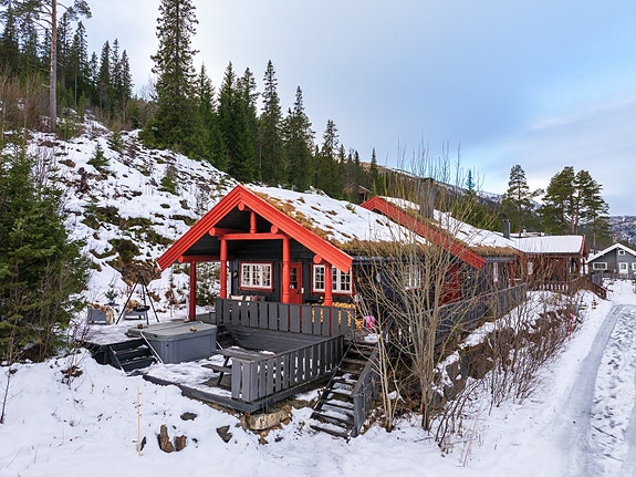 Hytta har en stor terrasse med flere platåer og er delvis overbygd. Utgang til terrasse fra stue og inngangsparti. Videre tilgang fra terrassen til uisolert bod på ca. 5 kvm.