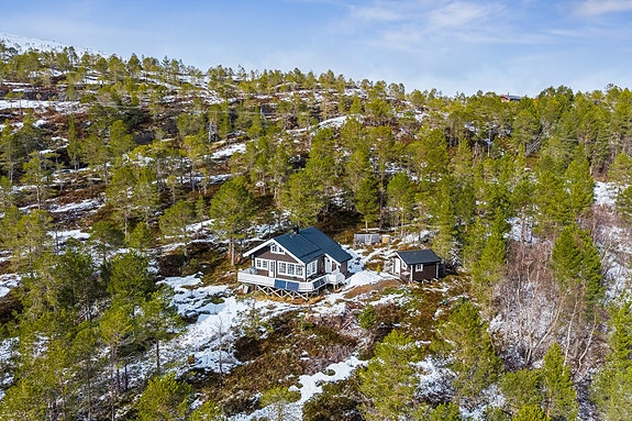 Stor og flott hytte på 81kvm m/​ uthus og nausttomt i naturskjønne omgivelser på Styrkesnes i Sørfold.
