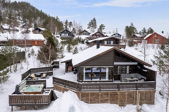 Drømmer du om en hytte som kombinerer komfort, naturskjønn beliggenhet og nærhet til aktiviteter? Da er denne hytta perfekt for deg som er glad i friluftsliv og ønsker en fredelig tilværelse omgitt av vakker natur. Bare 10 minutters spasertur fra Eikerapen Alpinsenter, er det kort vei til alpinbakker, skiløyper og turstier som kan nytes året rundt. Hytta ligger usjenert til på en solrik tomt med flott utsikt, gode solforhold hele dagen og store terrasser. Her finner du også et utendørs spabad med plass til seks personer, ideelt for rolige stunder etter aktive dager. Innh.: Gang, bad/vaskerom, bod, tre soverom og stue/kjøkken. Utvendig boder. Innredet romslig hems med to soveplasser. Dette er et sted hvor du kan nyte fred, privatliv og fantastisk natur, året rundt!