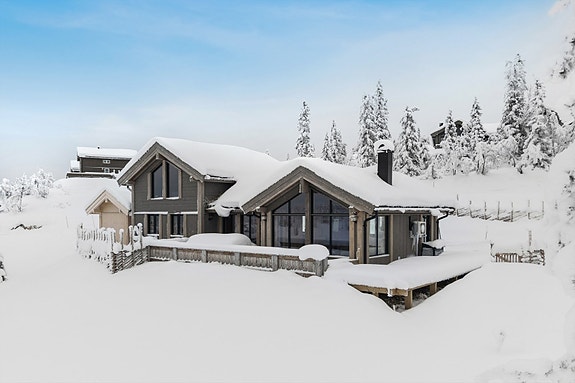 Hytta er ny og moderne og ligger vakkert til i et skrånende terreng med nydelig utsikt og gode solforhold.