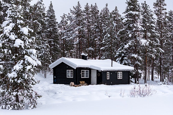 Denne tradisjonelle og koselige hytta ligger ved bredden av et lite tjern. Eiendomsfoto: Casper Uthus/ Uthus Photography