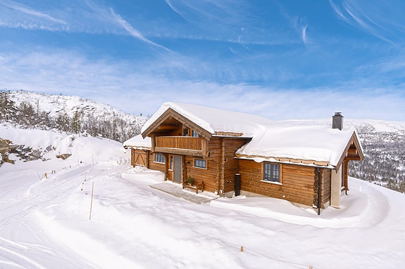 BROKKE - Eksklusiv håndlaftet hytte på nydelig utsiktstomt med gode solforhold. Sjelden mulighet.