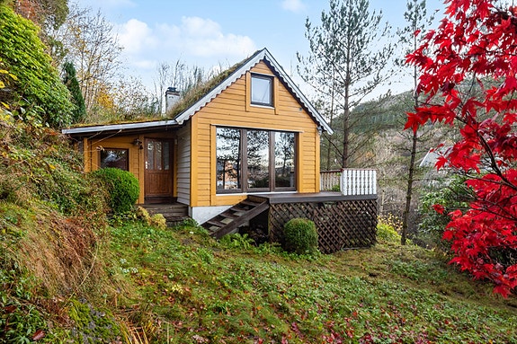 Hjellvik - Tepstad. Koselig hytte ca. 150 meter fra sjøen med båtfesterett. Vann, avløp, strøm, fiber, vei og parkering.