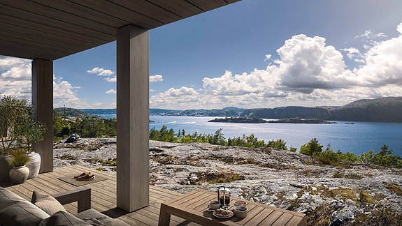 Illustrasjon fra terrassen på hyttene og utsikten mot Kragerø