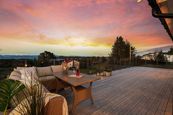 Flott hytte m/ nydelig utsikt og kort vei til sjø, turterreng og nærbutikk. Store uteplasser. Tilhørende båtfeste.