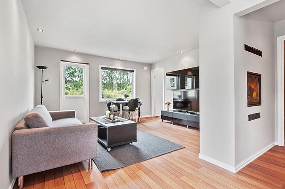 - Stue (med sofa, stuebord, teppe, TV-bord, TV, bokhylle, panelovn og peis)