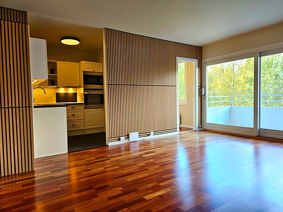 • Stue: Romslig og lys stue med store vindusflater og nymalte vegger, fontvegg i akustikkpanel som gir en ren og moderne atmosfære. Utgang til privat balkong med plass til sittegruppe.